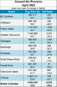 Vancouver, BC – May 12, 2022. The British Columbia Real Estate Association (BCREA) reports that a total of 8,939 residential unit sales were recorded by the Multiple Listing Service® (MLS®) in April 2022, a decrease of 34.9 per cent from a record April 2021. The average MLS® residential price in BC was $1.065 million, a 12.9 per cent increase from $943,765 recorded in April 2021. Total sales dollar volume was $9.5 billion, a 26.5 per cent decline from the same time last year.