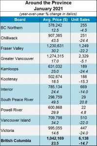 Vancouver, BC – February 14, 2022. The British Columbia Real Estate Association (BCREA) reports that a total of 6,138 residential unit sales were recorded by the Multiple Listing Service® (MLS®) in January 2022, a decrease of 14.7 per cent from January 2021. The average MLS® residential price in BC was $1,042,169, a 23.5 per cent increase from $843,918 recorded in January 2021. Total sales dollar volume was $6.4 billion, a 5.3 per cent increase from the same time last year.